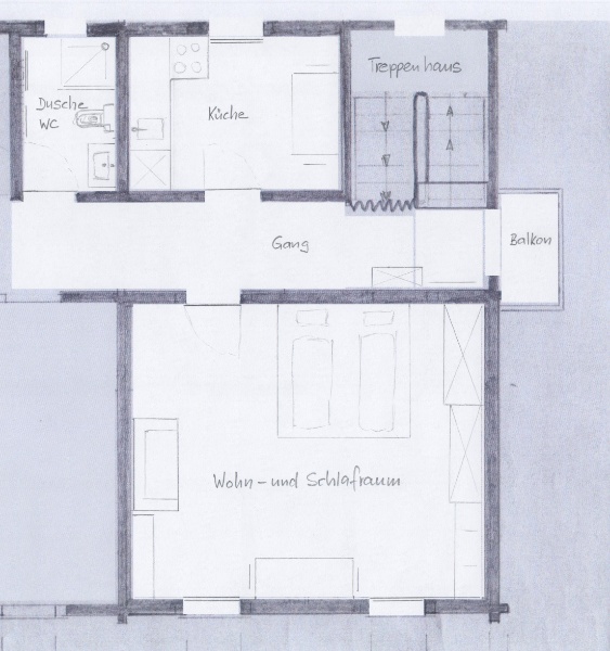 - 1 Zimmerwohnung mit Küche für 2 Personen,